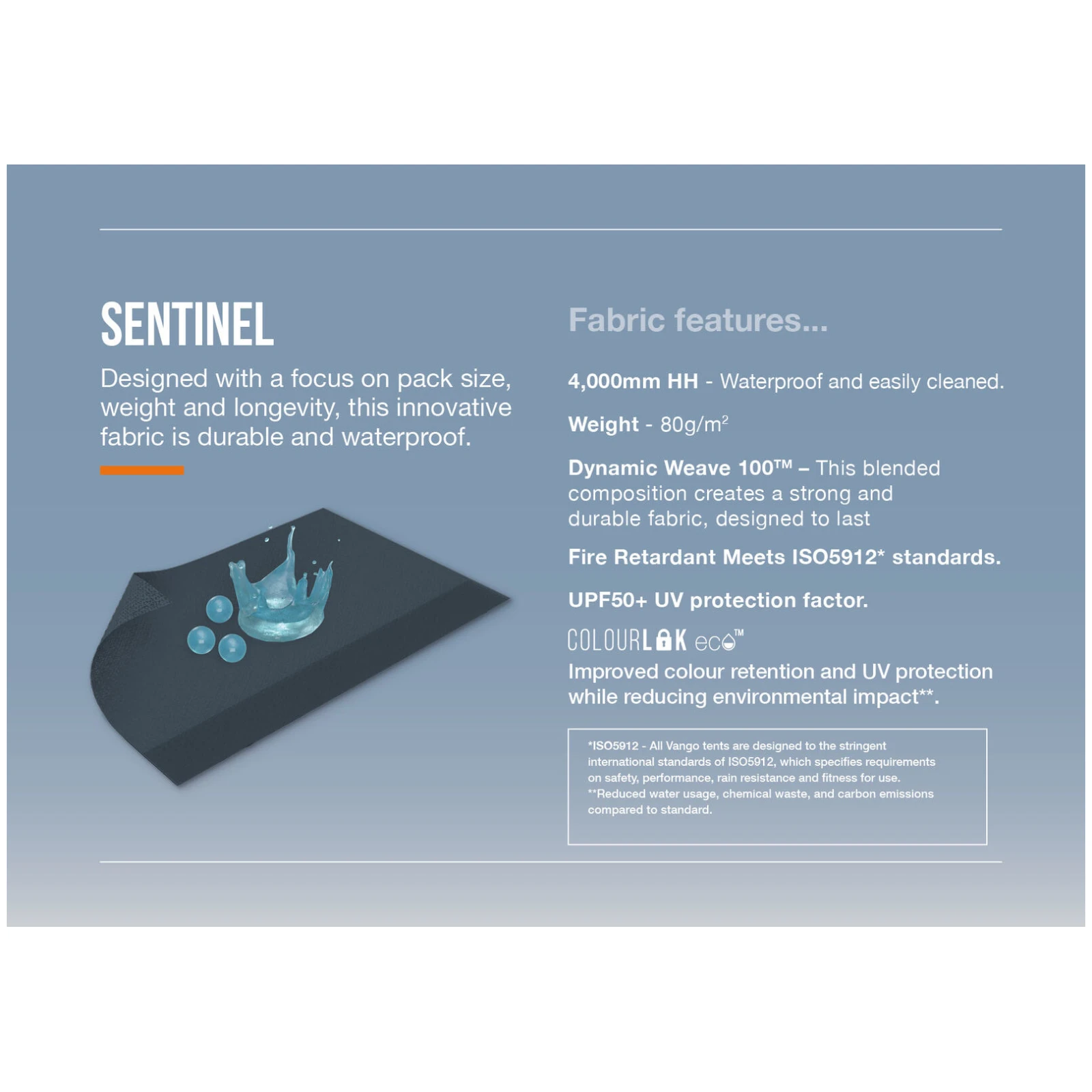 Le store latéral Sentinel Side Awning de la marque Vango est fabriqué en tissu résistant Dynamic Weave 100™ avec une colonne d'eau de 4 000 mm HH, qui se distingue par son excellent rapport résistance, poids et dimensions compactes une fois plié. Grâce à la technologie ColourLok, le matériau conserve sa couleur et ses propriétés fonctionnelles sur le long terme. La structure est composée de mâts en fibre de verre PowerFlex®, qui sont légers, résistants et fiables même par temps venteux.