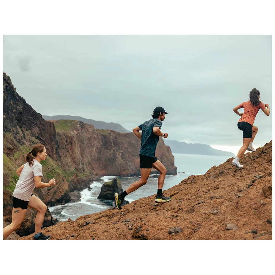Le confort est assuré par la semelle intermédiaire ZipFoam™, qui est plus élastique et conserve mieux son rebond que la mousse EVA standard. Son épaisseur atteint 38 mm sous le talon et 33 mm à l'avant, ce qui, associé à sa conception en forme de rocker, assure une transition fluide de l'impact au rebond, même dans les sections techniquement exigeantes où une protection accrue sous le pied est requise.