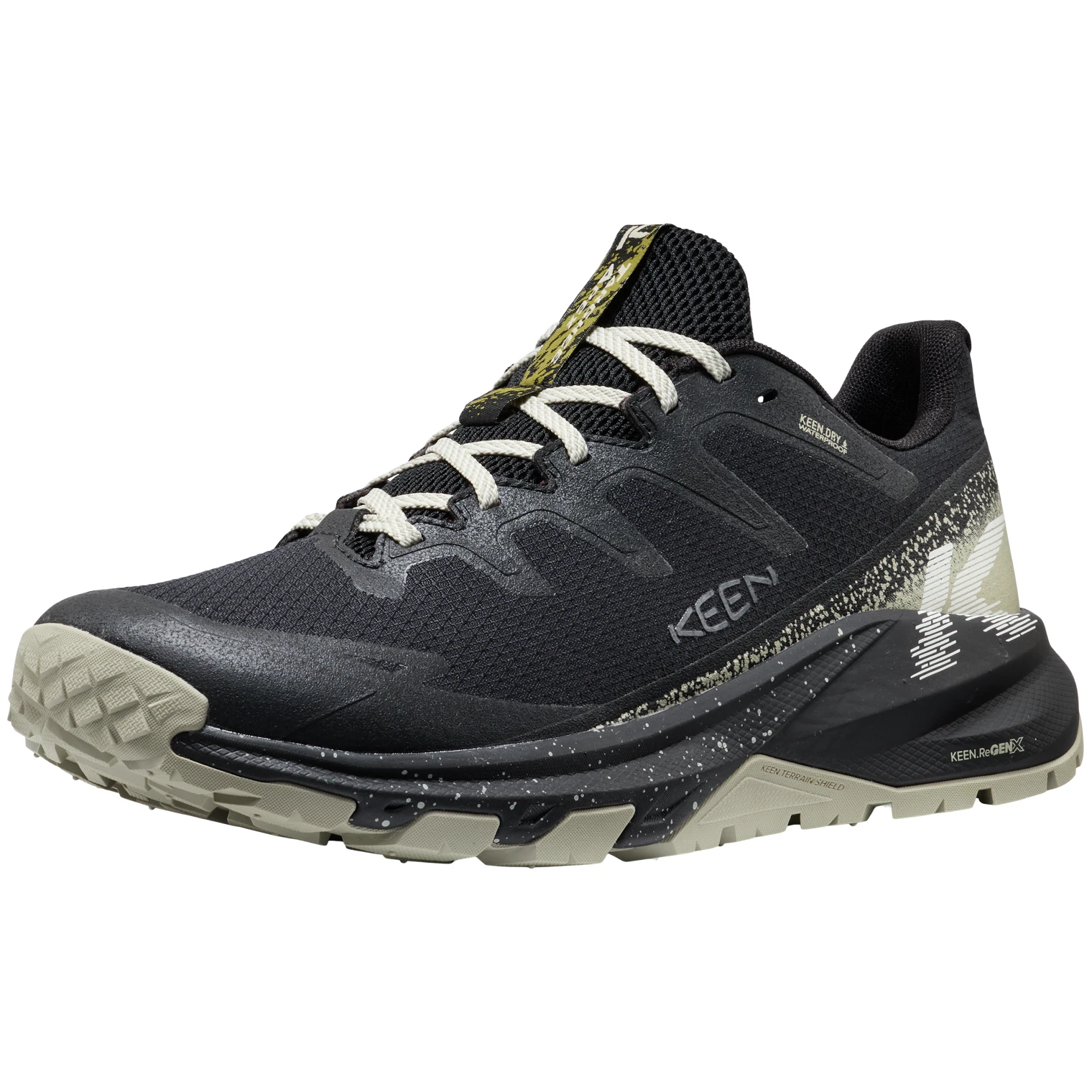 La tige en mesh résistant avec des renforts en TPU aide à protéger les zones sollicitées et augmente la durée de vie globale des chaussures. La membrane KEEN.DRY imperméable et respirante, associée à un traitement imperméable sans PFAS toxiques, aide à garder les pieds au sec même par mauvais temps, tandis que la doublure en mesh respirant contribue à un meilleur confort pendant le mouvement.