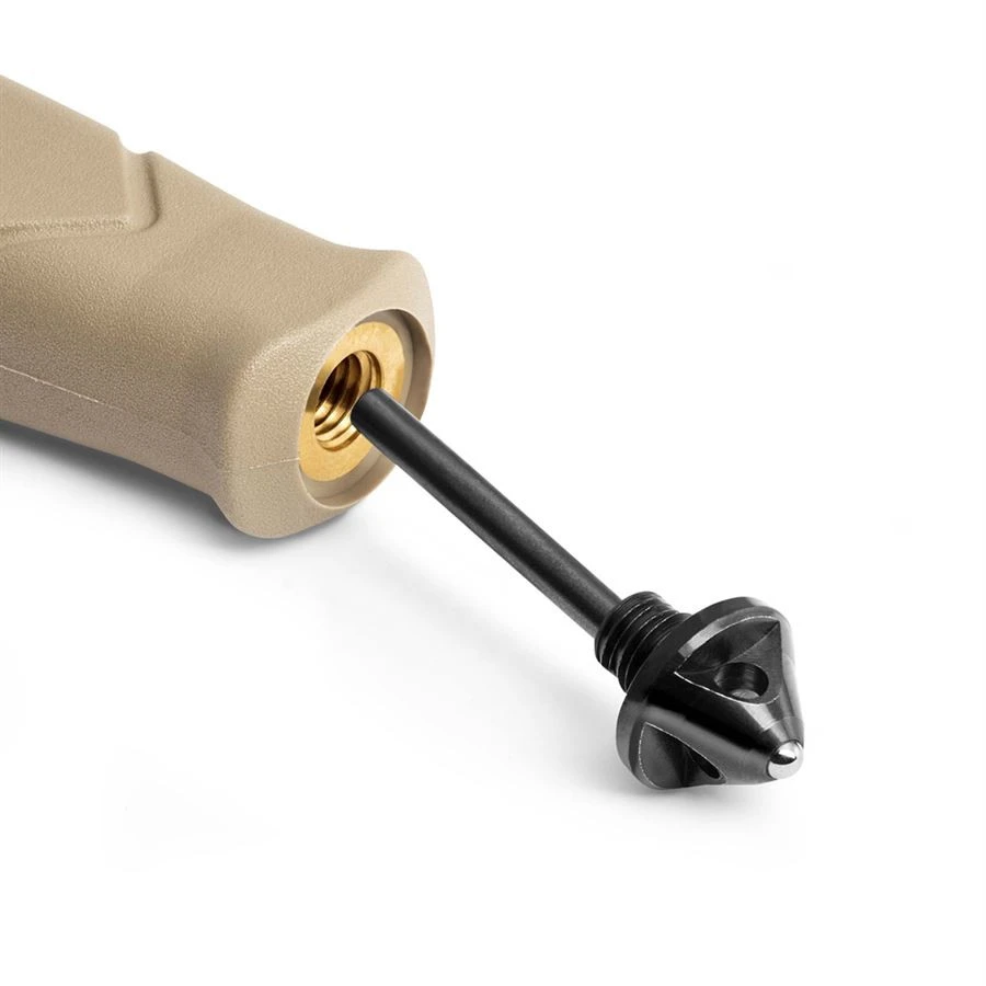 Les éléments de serrage de la lame permettent de couper les sangles de sécurité, les ceintures de sécurité, etc. Un brise-vitre de très grande capacité (formé d'une bille de carbure de tungstène de 4 mm) est également inclus. Il permet de briser facilement de grandes épaisseurs de verre ou de plexiglas. Le brise-vitre dévissé révèle un allumeur extrêmement efficace qui peut être activé par l'arrière de la lame sur sa partie crantée.