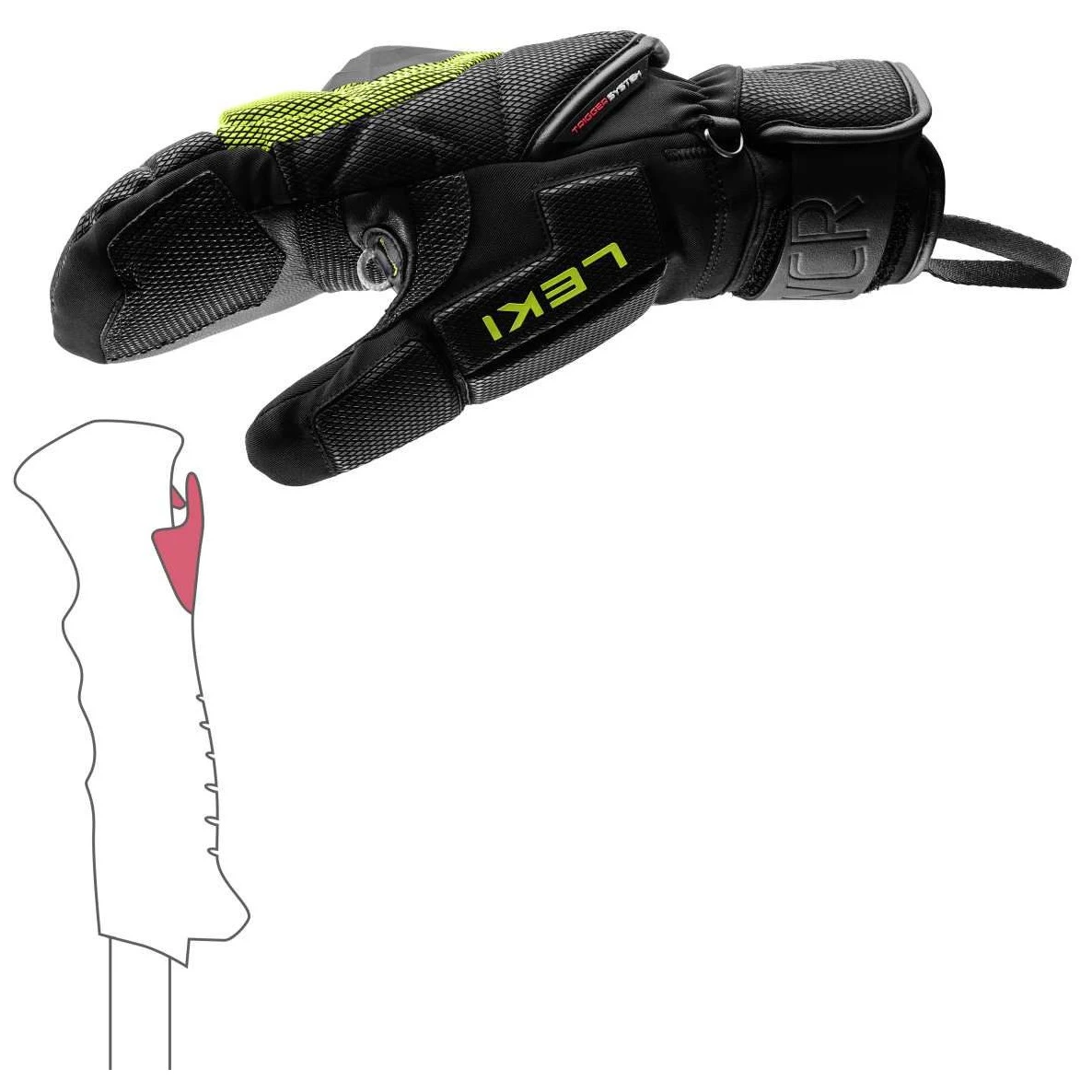 Grâce au système Trigger, vous pouvez facilement et en toute sécurité connecter les gants aux bâtons Leki. La connexion directe de la main et du bâton assure un contrôle précis, un enclenchement et un déclenchement rapides, et un dispositif de sécurité protège contre le risque de blessure en cas de chute. Les gants WCR Coach 3D Mitt sont donc l'équipement idéal pour tous ceux qui exigent des performances, une protection et un confort sans compromis lors du ski de compétition.