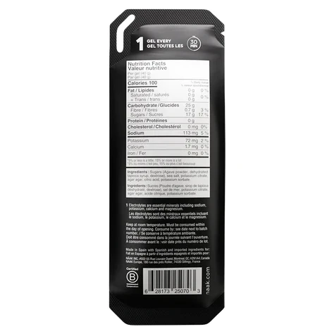 Naak Neutral Boost Energy™ Gel, avec son goût neutre et légèrement sucré, est idéal pour les athlètes qui souhaitent refaire le plein d'énergie sans risque de lassitude gustative. Chaque gel contient 25 g de glucides dans un rapport équilibré de sucres simples et complexes, assurant un apport énergétique rapide et durable. Le rapport glucose/fructose de 2:1 optimise l'absorption des sucres tout en minimisant les troubles digestifs. Le gel contient également 185 mg d'électrolytes (sodium et potassium) pour une reconstitution efficace des minéraux perdus par la transpiration. Il est fabriqué à partir d'agar-agar – une algue marine, ce qui rend le gel végan et sans gélatine, avec une agréable consistance de gelée qui facilite la déglutition pendant les efforts intenses. Le produit est basé sur des matières premières écologiquement responsables, telles que le sirop d'agave et l'amidon de tapioca, qui sont une alternative plus durable aux sucres traditionnels.