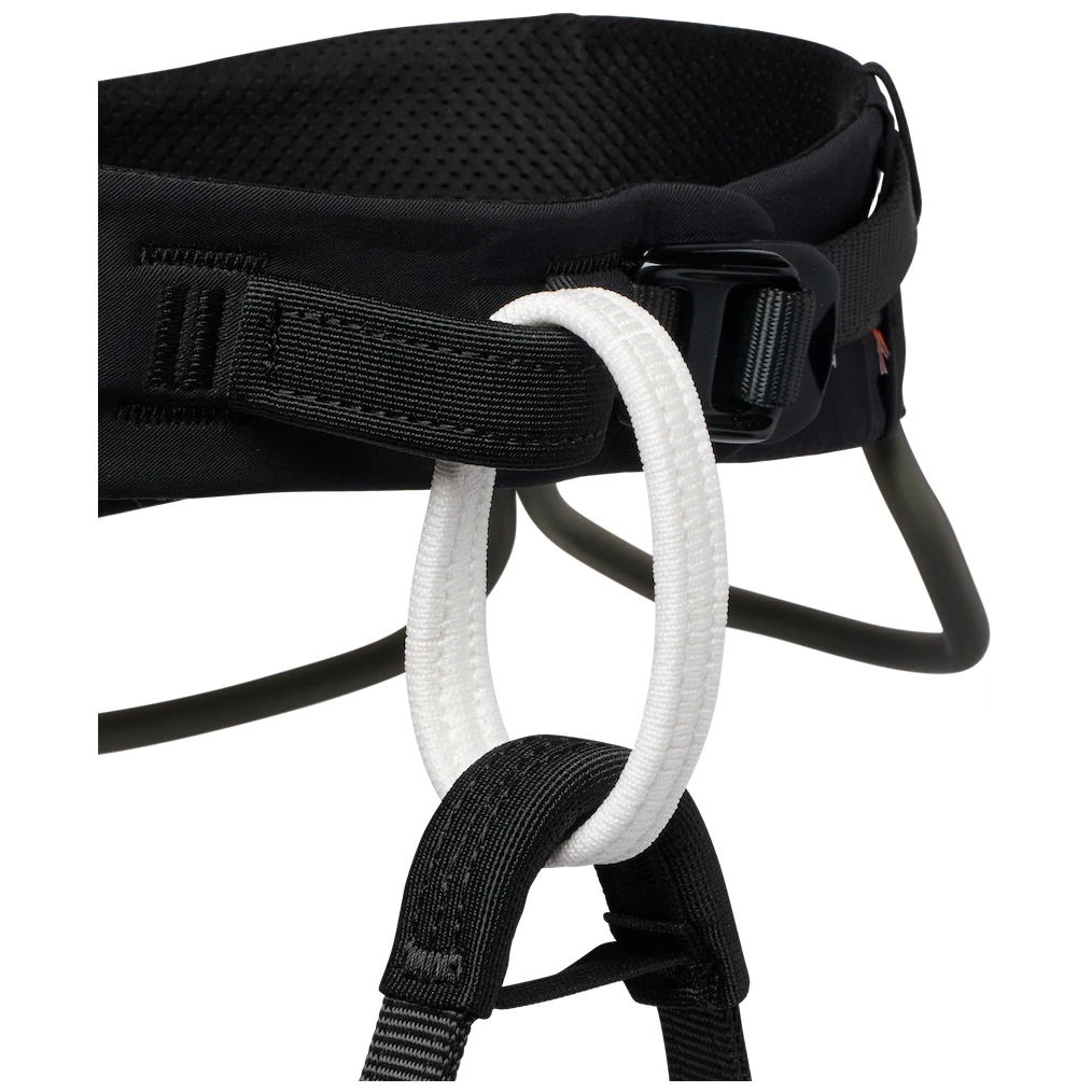 Pour l'assurage, il y a la boucle sans couture Infinity Loop. Sur le harnais, vous trouverez quatre porte-matériel de grande capacité, thermoformés, qui peuvent accueillir jusqu'à trente dégaines. Le cinquième porte-matériel discret à l'arrière est très facilement accessible.