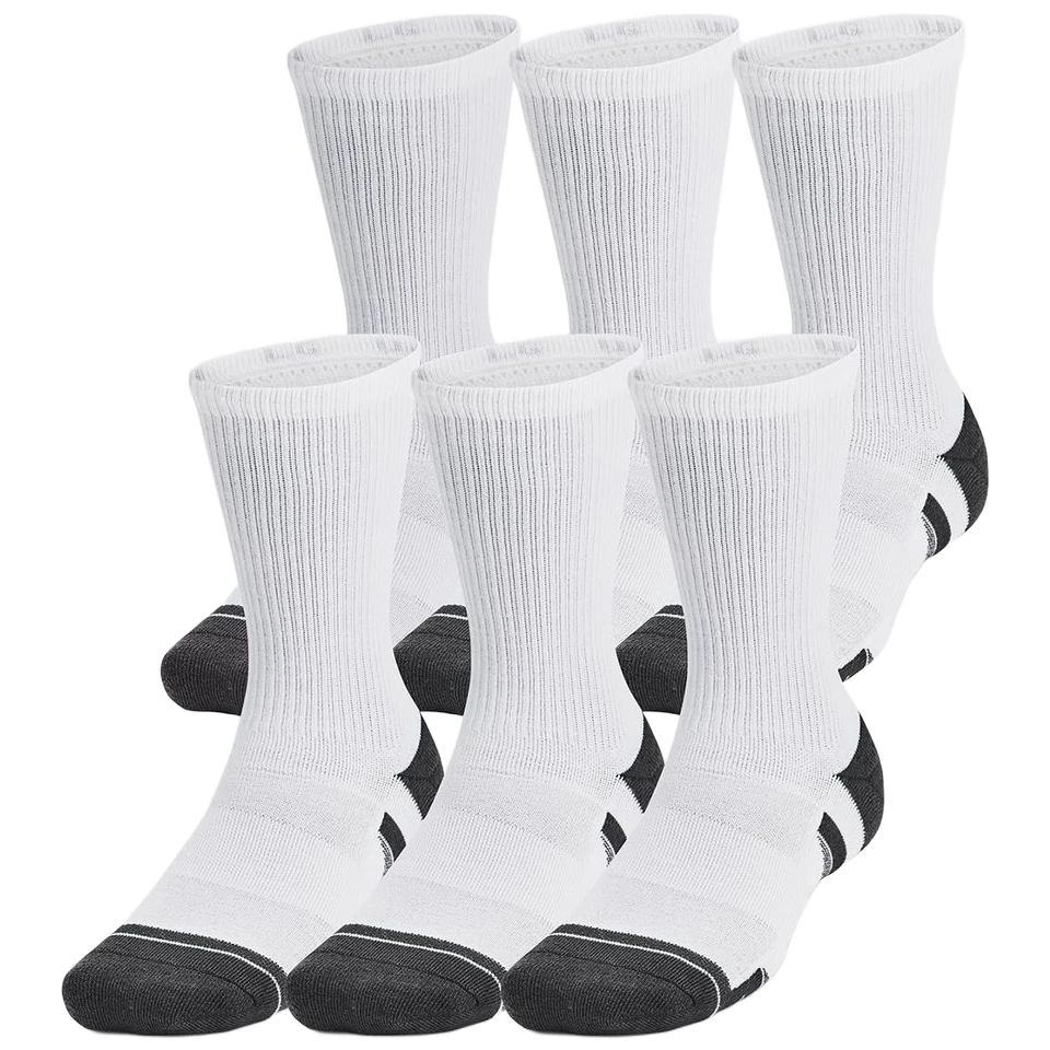 La paire de chaussettes unisexe Perf Tech 6Pk Crew de Under Armour est résistante, évacue la transpiration et sèche vraiment rapidement. La nouvelle construction Locked-In Fit maintient la chaussette bien en place sur le talon. Les chaussettes ont un amorti moyen sur toute la surface du pied et des panneaux en mesh sur le cou-de-pied pour une meilleure respirabilité. Le soutien de la voûte plantaire intégré aide à réduire la fatigue du pied.