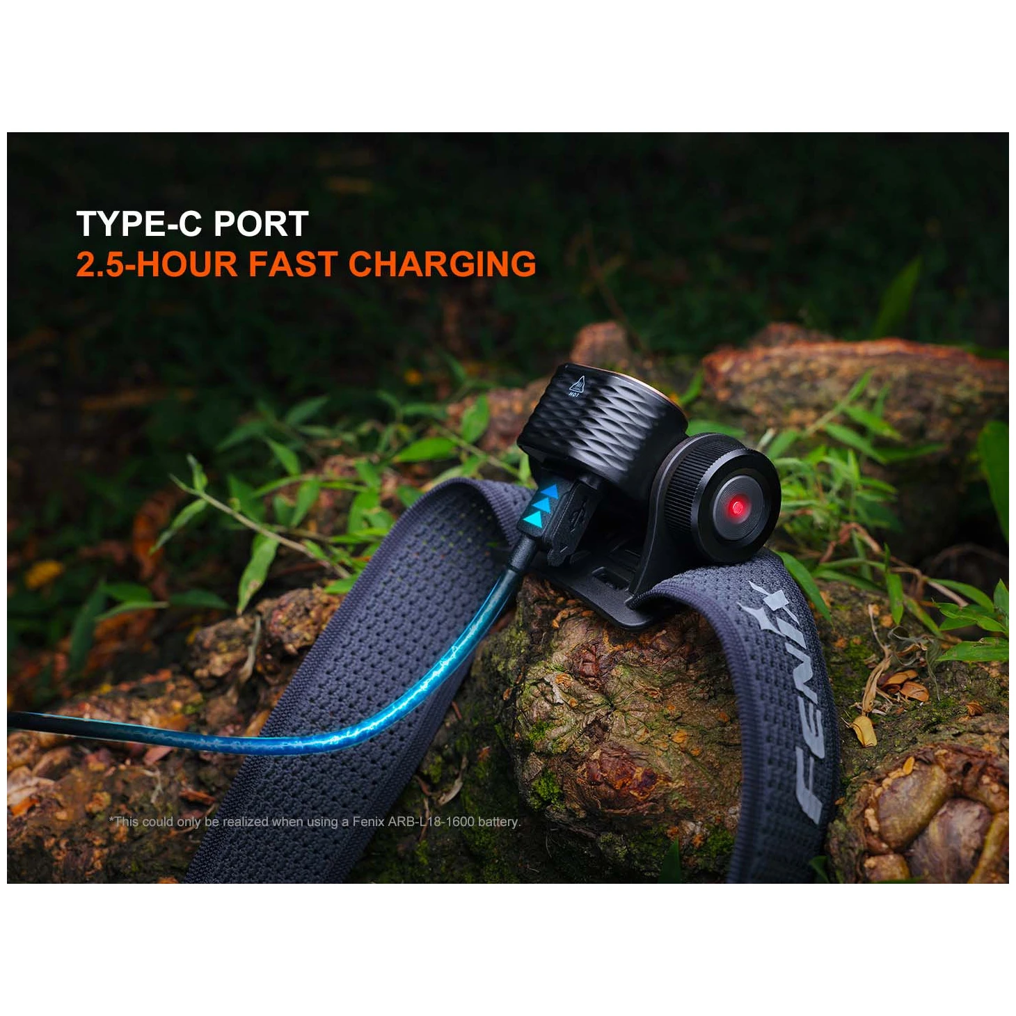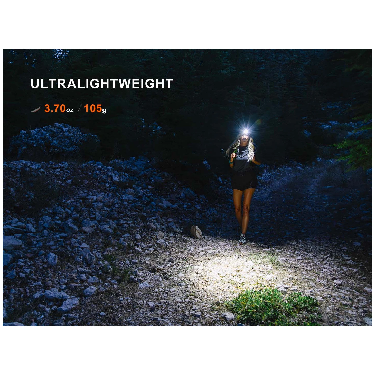Une lumière rouge et un clignotant de 5 lumens sont également disponibles. Elle utilise une batterie Li-ion de type 18350 d'une capacité de 1600 mAh pour l'alimentation, qui est incluse dans l'emballage et se recharge via un connecteur USB-C moderne directement dans la lampe frontale. La lampe frontale peut également être alimentée en cas d'urgence par des batteries RCR123A (16340) et une pile CR123A à usage unique. La lampe frontale est équipée d'une large sangle confortable. La sangle est perforée pour une évacuation rapide de la transpiration et équipée d'éléments réfléchissants pour assurer une bonne visibilité passive lors de la course sur route.