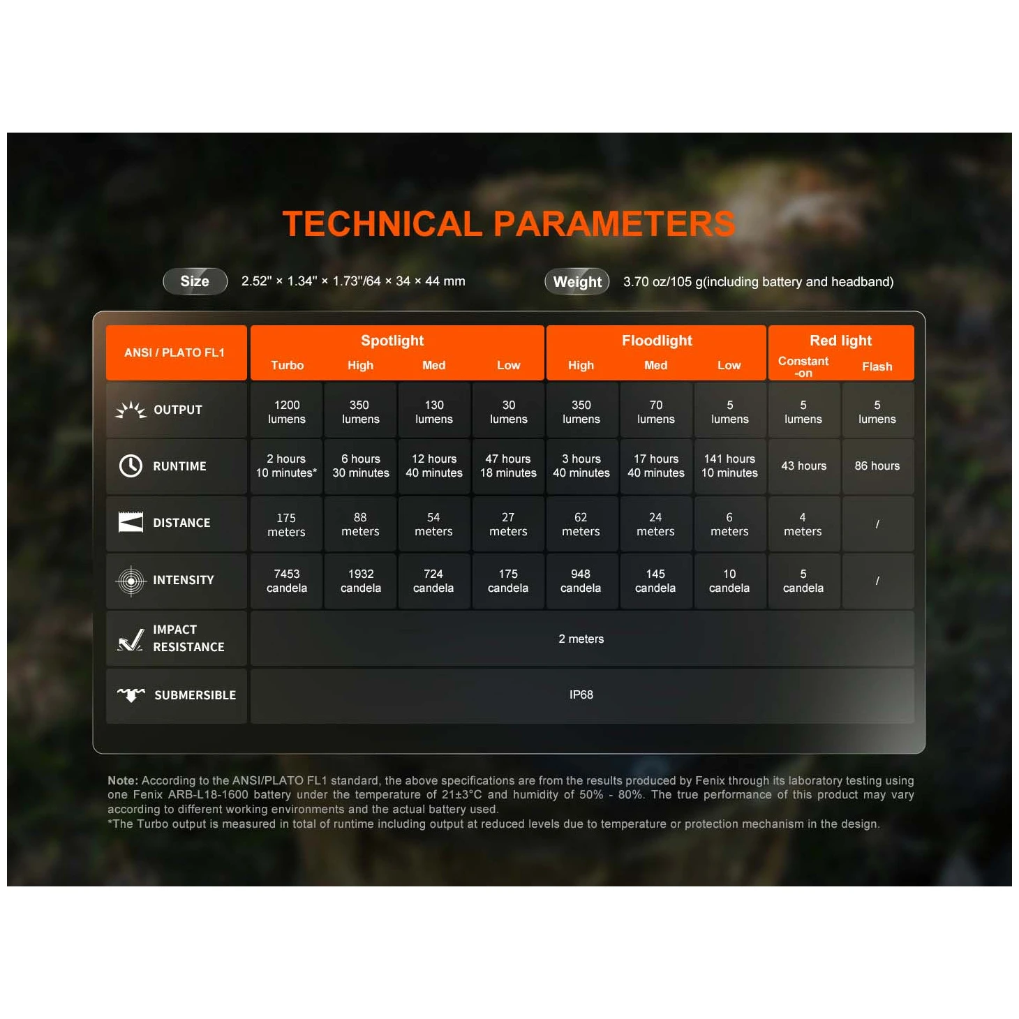 Tous les paramètres des lampes frontales (flux lumineux, autonomie, étanchéité, portée et résistance aux chocs) sont mesurés conformément à la norme ANSI/NEMA FL 1-2009.