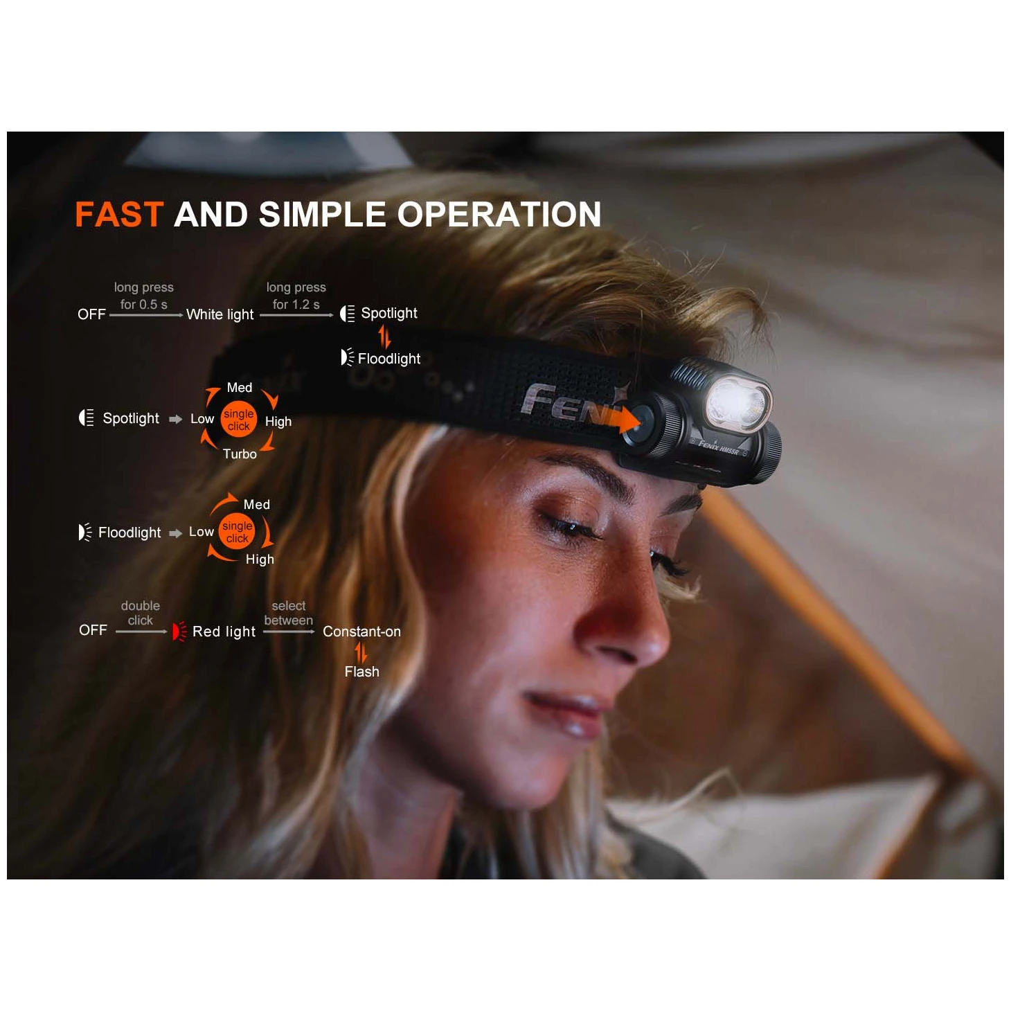 Grâce à sa batterie Li-ion compacte de type 18350, elle ne pèse que 105 grammes, mais sa puissance maximale de 1200 lumens avec une portée allant jusqu'à 175 mètres vous impressionnera. Elle offre trois types d'éclairage – longue portée, large et rouge – vous avez donc toujours la bonne lumière à portée de main, que vous exploriez le terrain, travailliez dans l'atelier ou que vous souhaitiez simplement lire dans la tente.