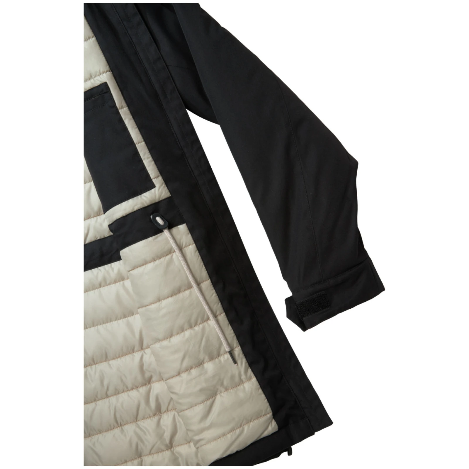 La coupe classique du manteau avec cordon de serrage à la taille vous permet de l'adapter à votre style, tandis que les manches peuvent être facilement ajustées à l'aide d'un velcro. La capuche fixe réglableet la fermeture à glissière osseuse à double sens avec effet métallique confèrent au manteau un aspect moderne et augmentent sa fonctionnalité.