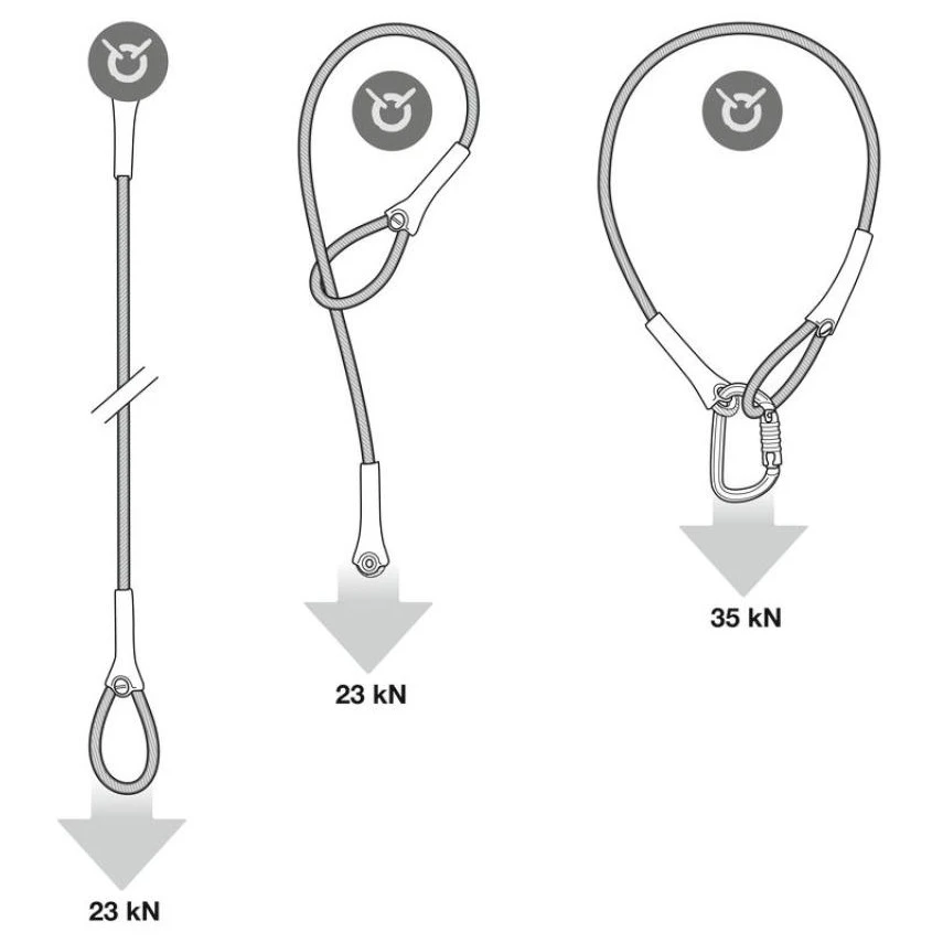 Le WIRE STROP est une boucle d'ancrage en acier galvanisé de 6,5 mm de diamètre avec deux extrémités de tailles différentes.