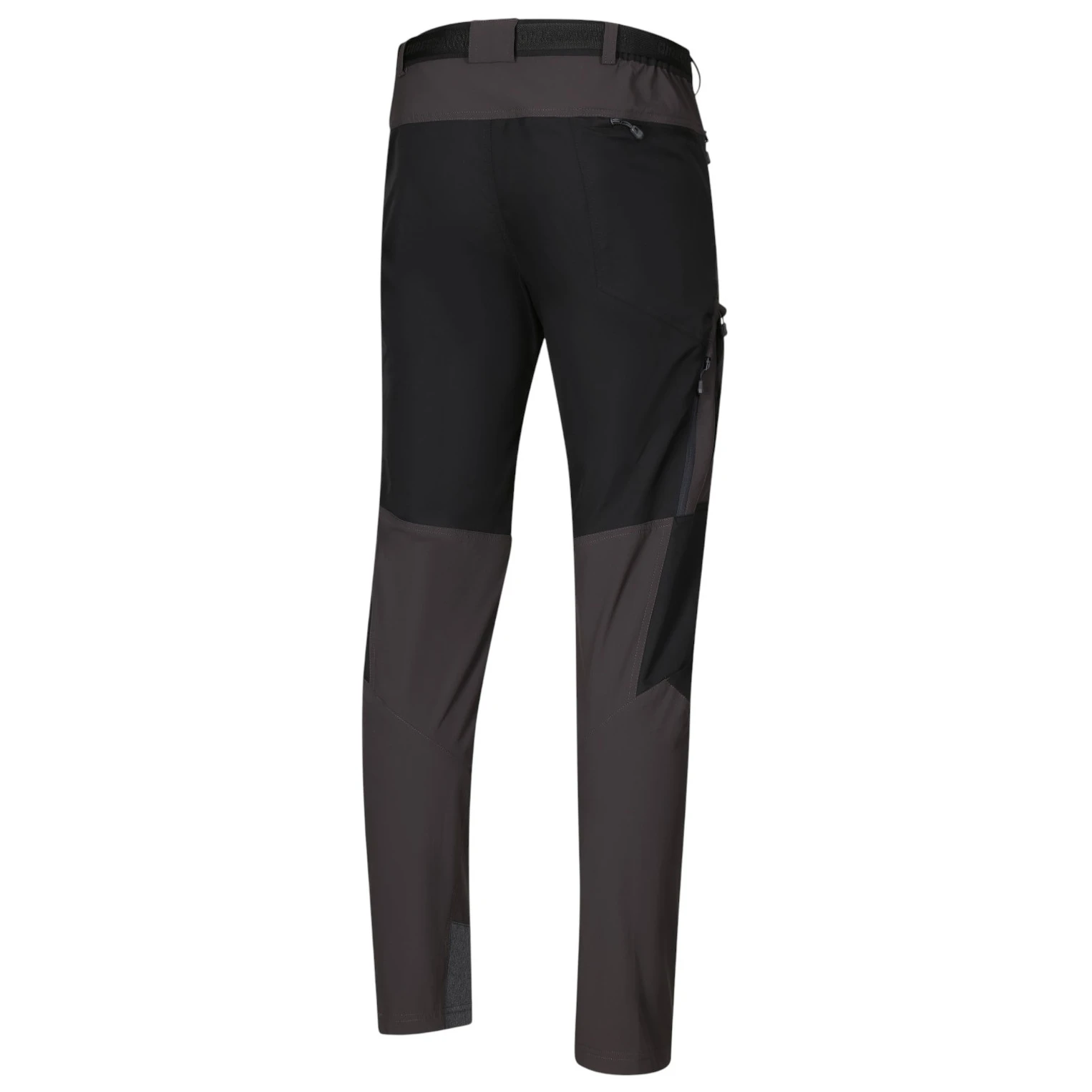 Le pantalon possède une ceinture confortable et légèrement élastique, partiellement élastique, réglable avec une ceinture à boucle. Il dispose de deux poches avant zippées, d'une poche arrière et d'une poche latérale pour un rangement sécurisé des petits objets. Une caractéristique pratique est l'option d'ouvrir et d'aérer le côté du pantalon, ce qui aide à réguler la température lors d'un effort accru.