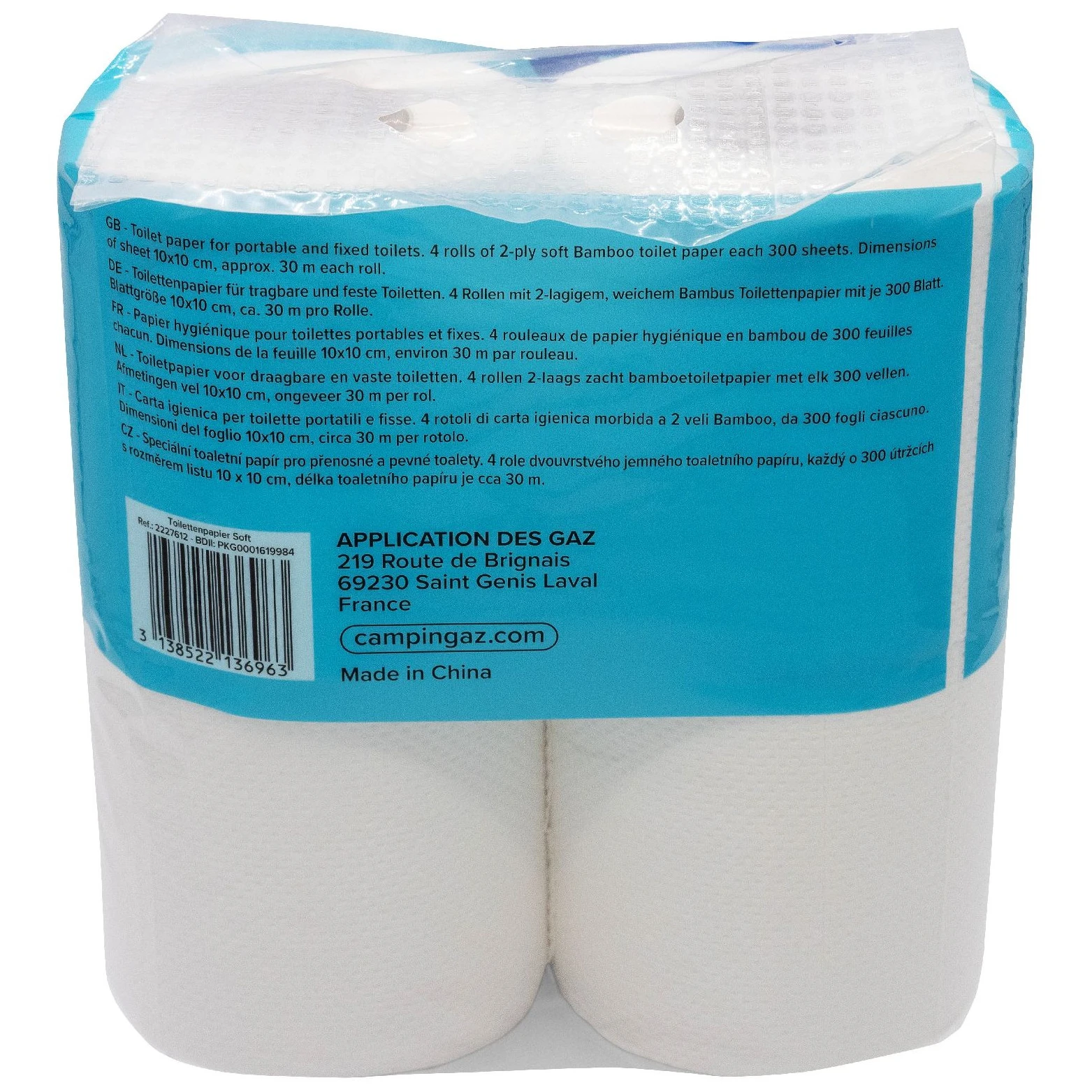 Papier toilette de la marque Campingaz fabriqué à partir de cellulose, adapté à tous les types de toilettes chimiques.