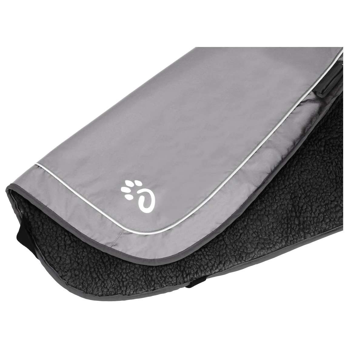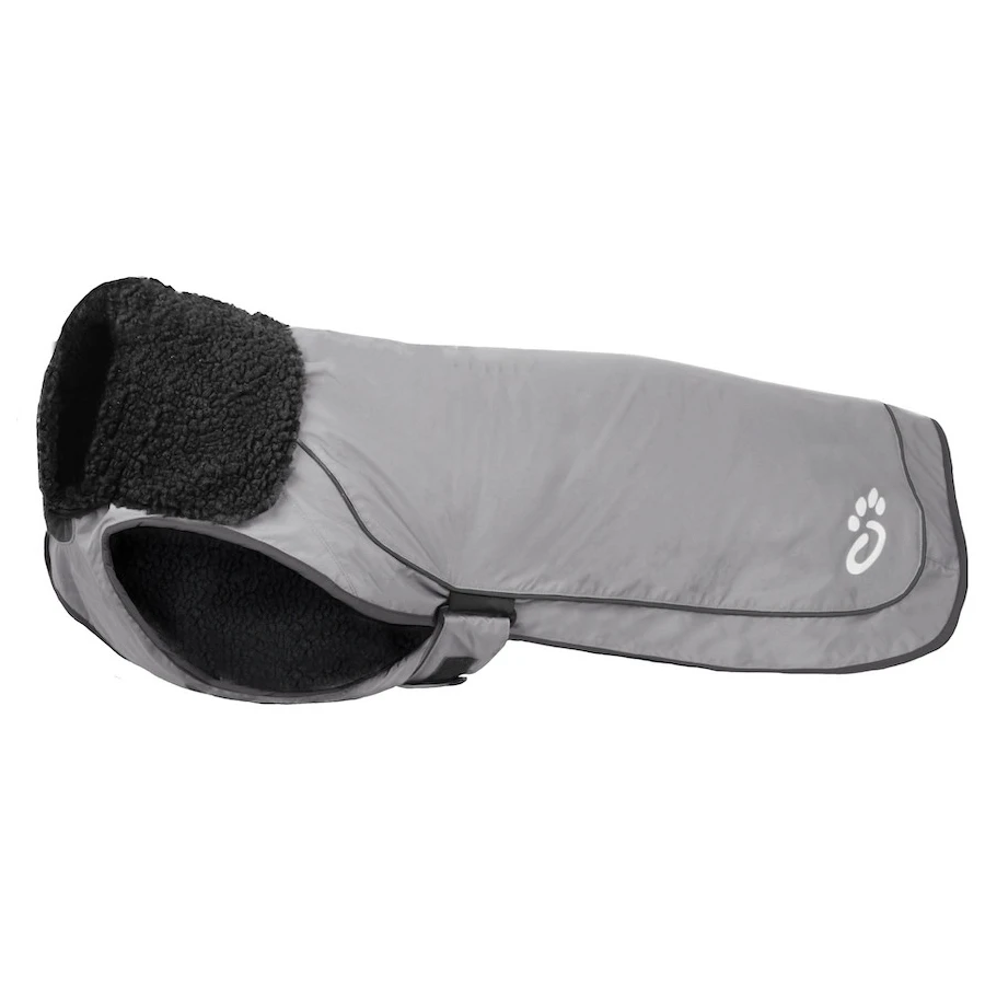 Le matériau extérieur en nylon est résistant et réfléchissant sur toute la surface, ce qui rend le chien très visible même dans des conditions de faible luminosité. L'intérieur est doté d'une doublure chaude en polaire agréable au toucher. Grâce à sa coupe confortable, le manteau couvre bien le poitrail et protège le cou. La fermeture auto-agrippante est complétée par des sangles autour des pattes arrière, qui empêchent le manteau de se soulever par vent ou lors des mouvements. Derrière le col, il y a une ouverture zippée pour attacher la laisse au harnais.