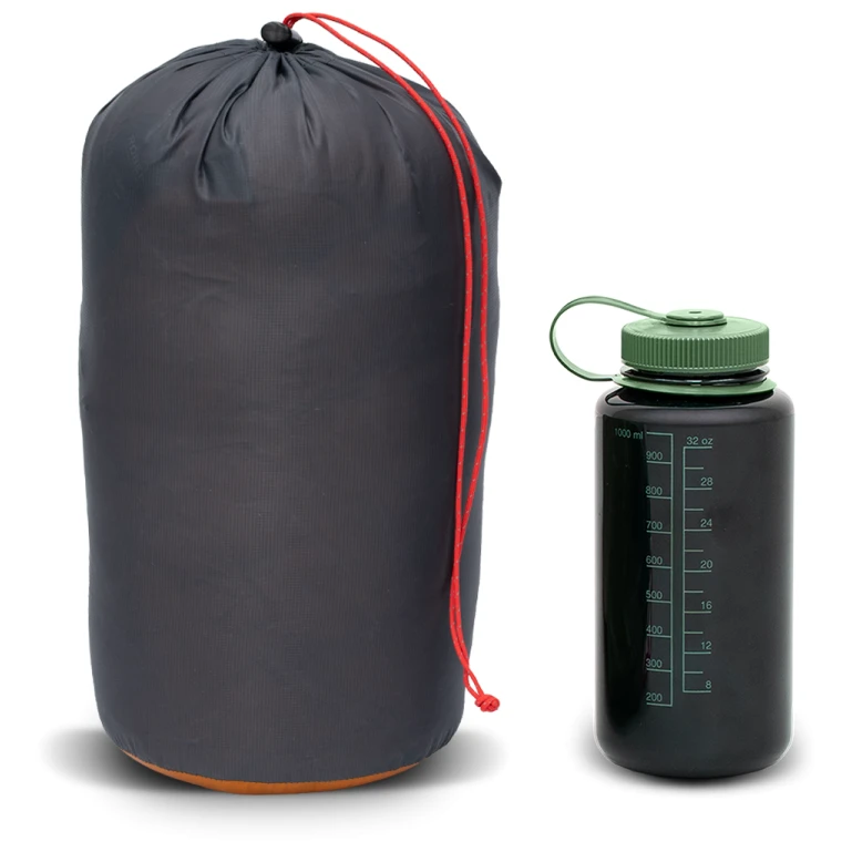 De plus, le sac de couchage dispose d'un bouton-pression au cou, de cordons de serrage internes et d'une poche intérieure. Les matériaux ne contiennent pas de PFAS, et pour le duvet, le certificat Responsible Down Standard est respecté, garantissant de bonnes conditions d'élevage des animaux.