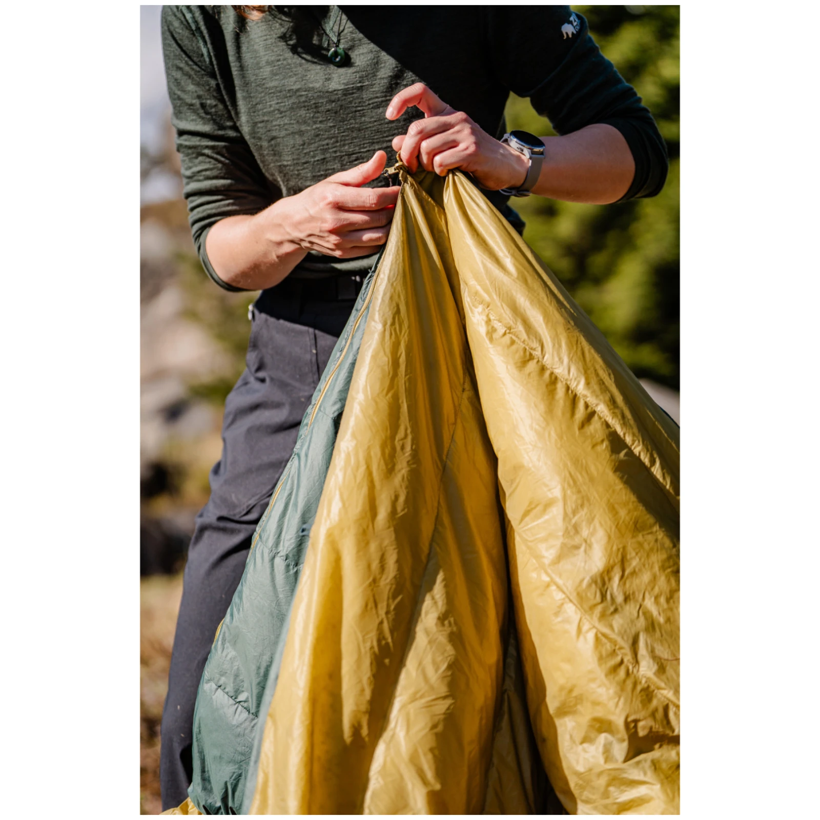Le quilt est conçu pour être le plus polyvalent possible. À l'aide de sangles amovibles, il peut être fixé à un matelas de couchage, ce qui élimine les pertes de chaleur le long des côtés et empêche de glisser pendant le sommeil. Dans la partie inférieure, il est possible de relier le quilt dans un tunnel fermé, de sorte qu'il peut être utilisé de la même manière qu'un sac de couchage classique. Les pieds restent protégés et la partie supérieure reste plus libre pour plus de confort ou de ventilation. Par temps froid, il peut être utilisé comme couche supplémentaire pour augmenter le confort thermique d'un sac de couchage classique. En plus d'être utilisé pour les nuits dans la nature, le quilt peut également servir de couverture polyvalente pour se reposer dans un camping, un bivouac ou comme couverture de voyage légère et pliable.