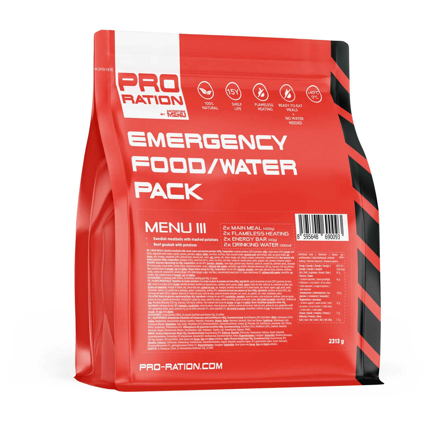 - durée de conservation extrême – aliments 15 ans, eau 50 ans