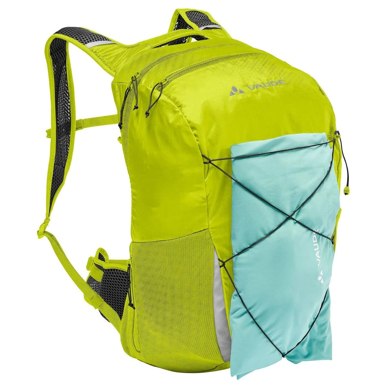 L'agencement pratique comprend un compartiment principal, une poche avant zippée, une poche latérale extensible et une poche latérale zippée – idéal pour un téléphone, une collation ou de petits objets. Le laçage avant multifonctionnel 3 en 1 permet de comprimer le sac à dos et de fixer une veste ou des bâtons de randonnée, tout en servant de support de casque. Bien sûr, il y a une ouverture pour un système d'hydratation, des éléments réfléchissants, la possibilité de fixer une lumière et une housse de pluie intégrée.