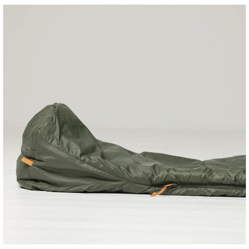 Le sac de couchage a une coupe momie, une capuche étroite avec un cordon de serrage simple et une zone de pieds anatomiquement formée pour plus de confort des pieds. La fermeture éclair intégrale à double curseur est équipée d'une bande anti-vent et d'un curseur supérieur pour empêcher le tissu de se coincer. Elle comporte une poche intérieure pour les petits objets et des boucles de suspension en bas pour une ventilation ou un rangement faciles. Il est livré avec un sac de rangement et convient aux personnes mesurant jusqu'à 190 cm.