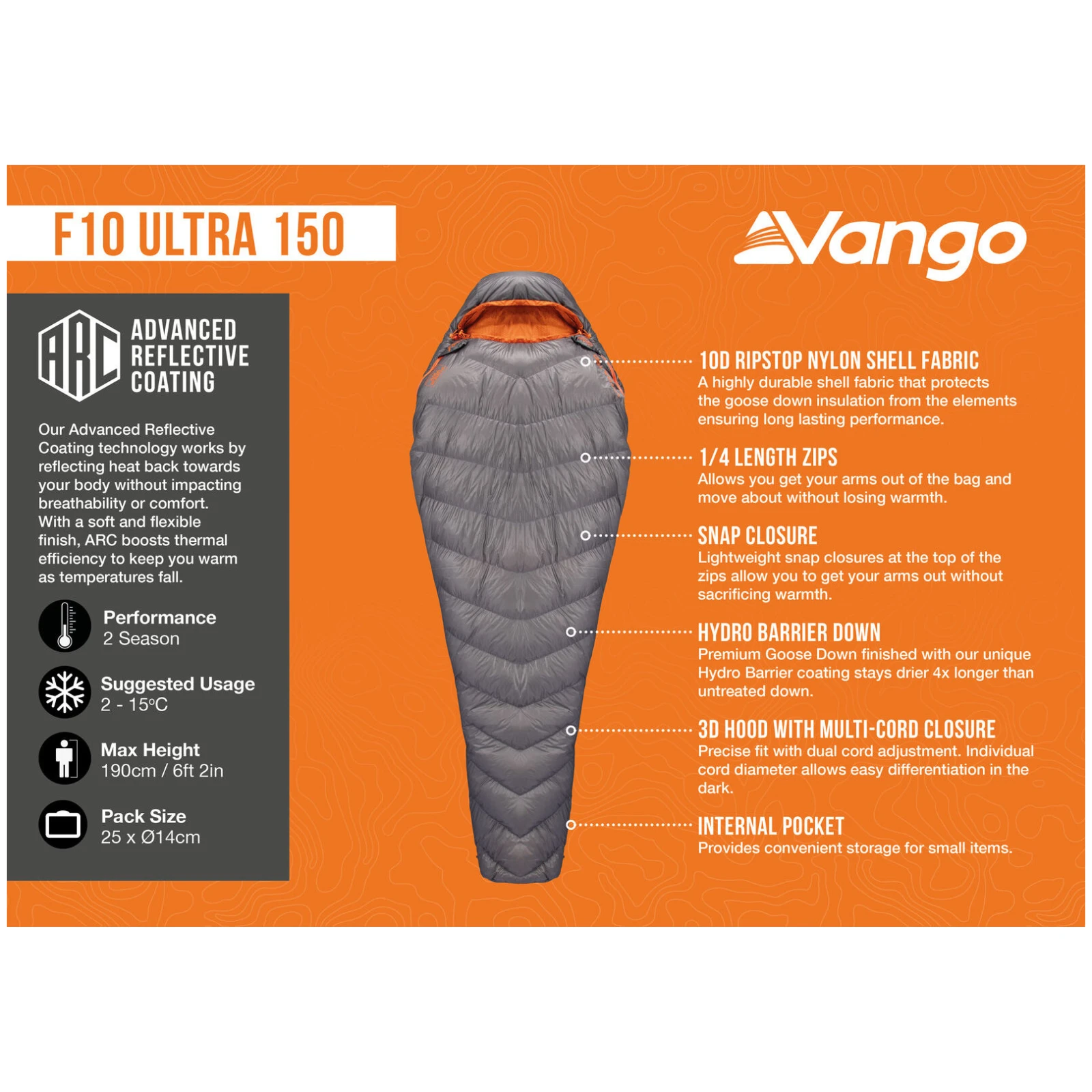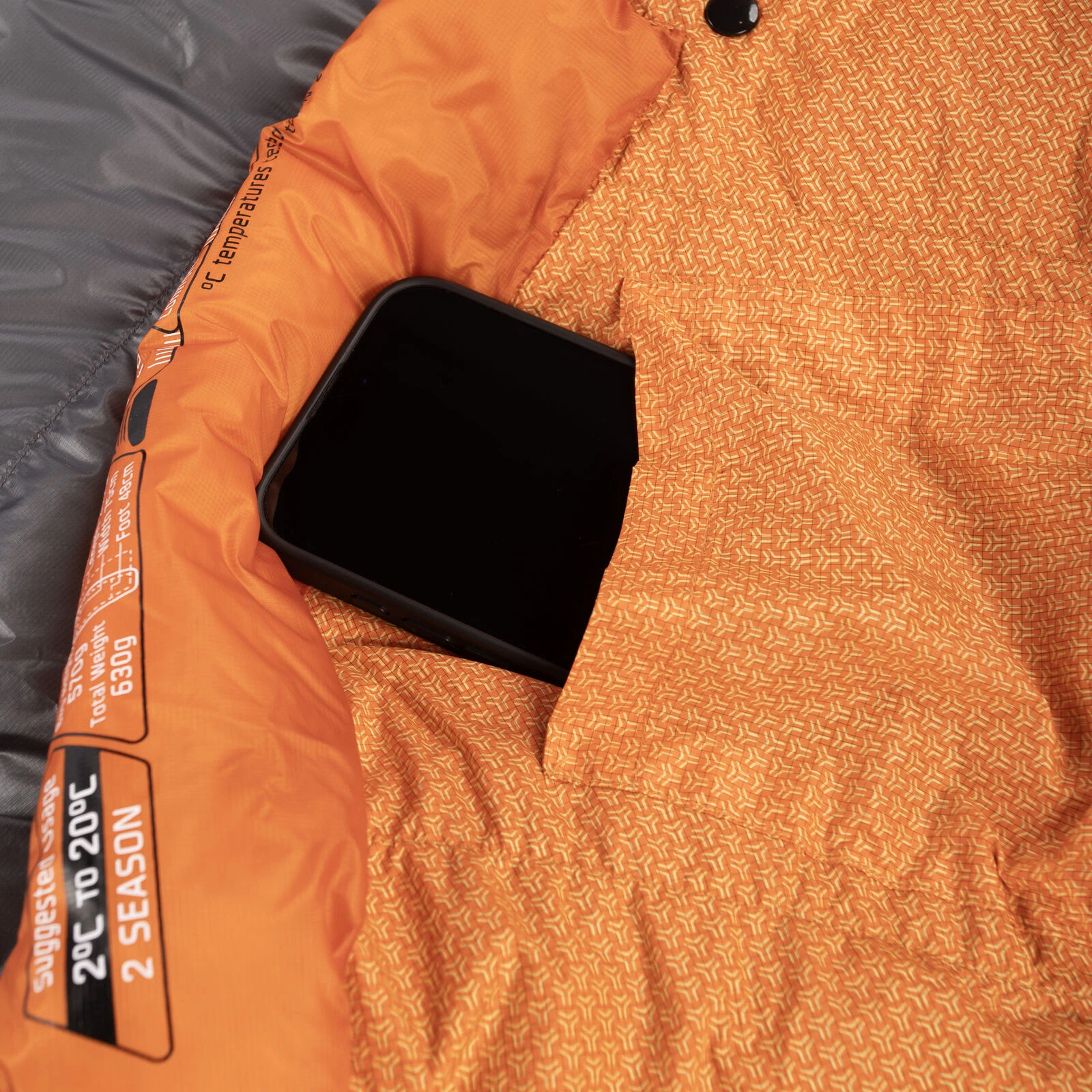 Le tissu extérieur en nylon ripstop 10D est léger, mais très résistant. À l'intérieur du sac de couchage se trouvent 150 g de duvet d'oie de première qualité avec un pouvoir gonflant de 1000 cuin, traité avec la technologie Hydro Barrier Down – le duvet conserve ainsi ses propriétés isolantes jusqu'à 4 fois plus longtemps, même lorsqu'il est humide. La technologie ARC (Advanced Reflective Coating), stratégiquement positionnée, réfléchit la chaleur corporelle vers vous sans réduire la respirabilité ni le confort.