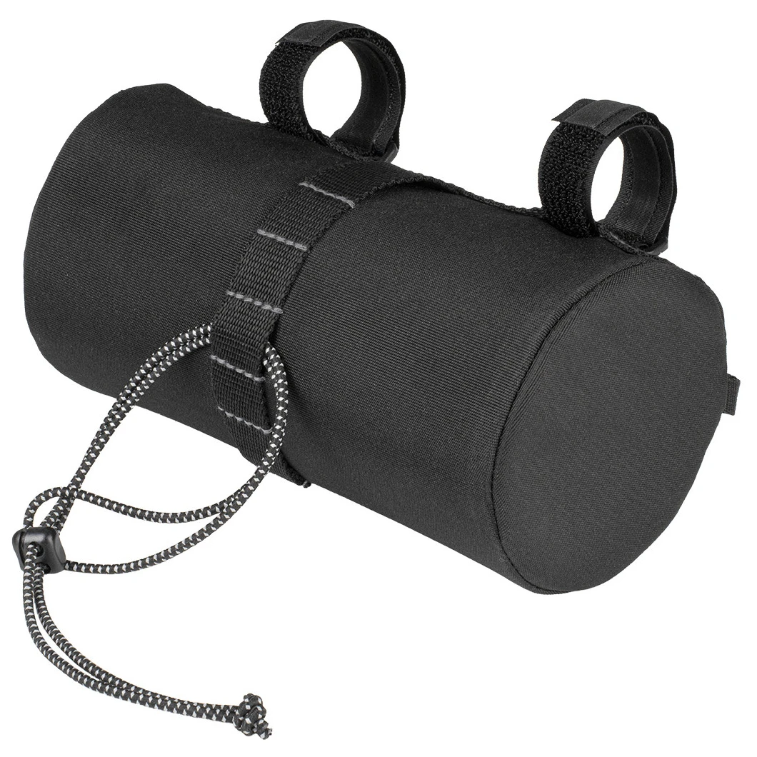 Le sac est fabriqué en polyester 600D durable qui repousse l'eau et les taches. Il se fixe à l'aide de deux sangles antidérapantes et d'un cordon élastique, assurant un maintien stable sur différents types de guidons. Un élastique à l'extérieur permet de fixer des objets souples tels que des gants ou un coupe-vent.