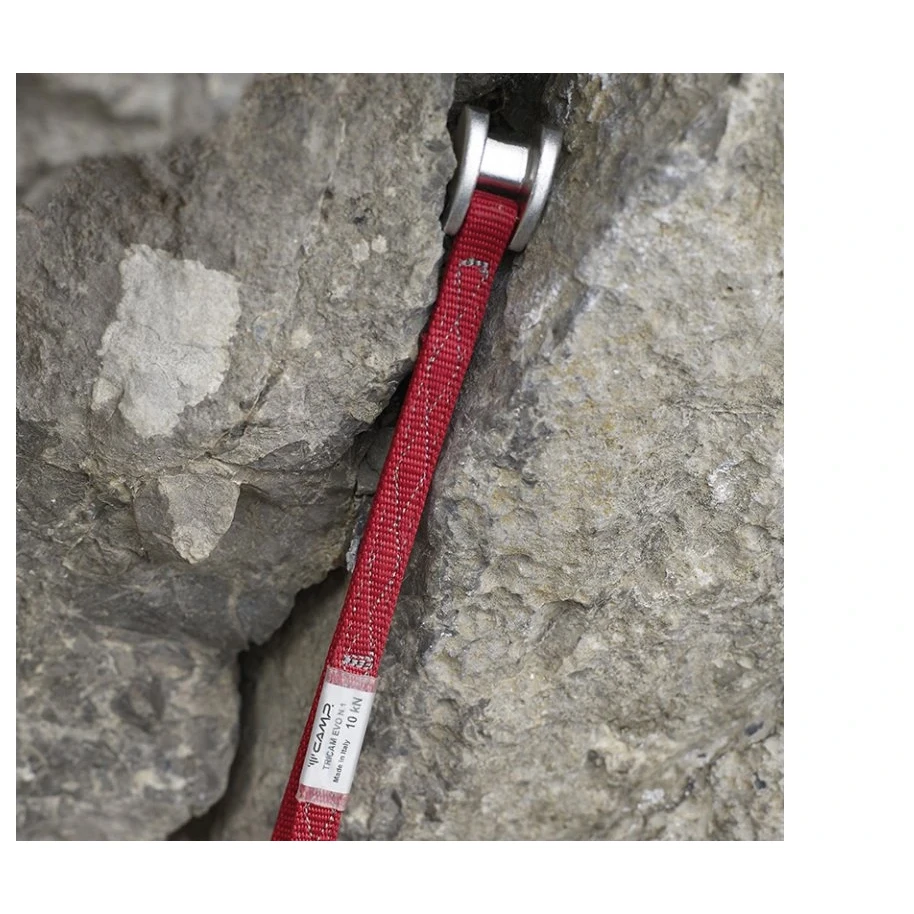 Le jeu de coinceurs Camp Tricam Evo fait partie des outils classiques de tout grimpeur classique. Grâce à leur forme triangulaire, ils sont très polyvalents et tiennent horizontalement et verticalement dans les fissures horizontales. Ils peuvent également être utilisés pour réparer les trous et les endroits où rien d'autre ne tient, ou les joints glacés. Ils sont très légers grâce à la fixation uniquement sur la boucle. La boucle est également renforcée par une couture dans la partie supérieure afin de faciliter la mise en place d'une seule main et d'augmenter la résistance à l'abrasion sur les arêtes. Il offre des modes de placement actifs et deux modes passifs. Le deuxième placement passif est possible grâce à la tête renforcée en forme de coin et peut également être placé en largeur.