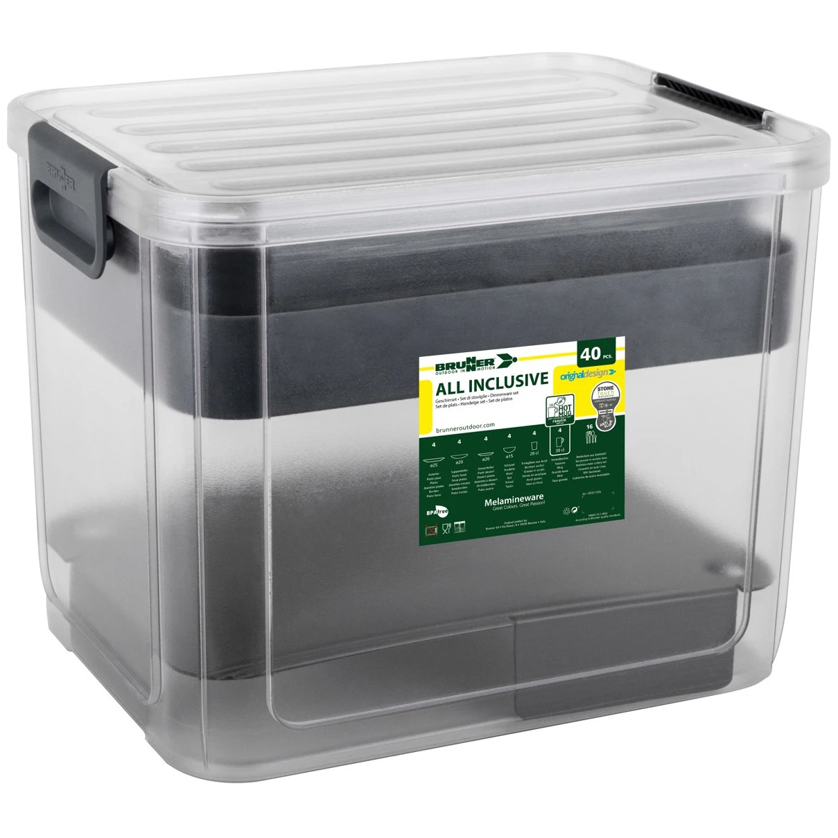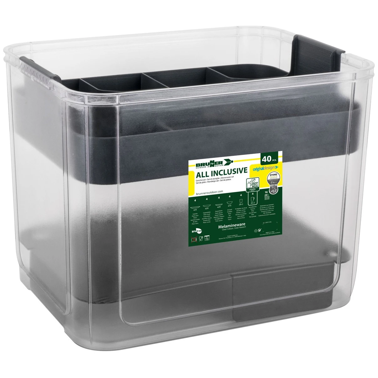 La vaisselle All Inclusive VIP Granada Brunner comprend un total de 40 pièces, fabriquées dans une combinaison de mélamine et de poudre minérale pour une résistance à toute épreuve, avec en plus un caoutchouc antidérapant.