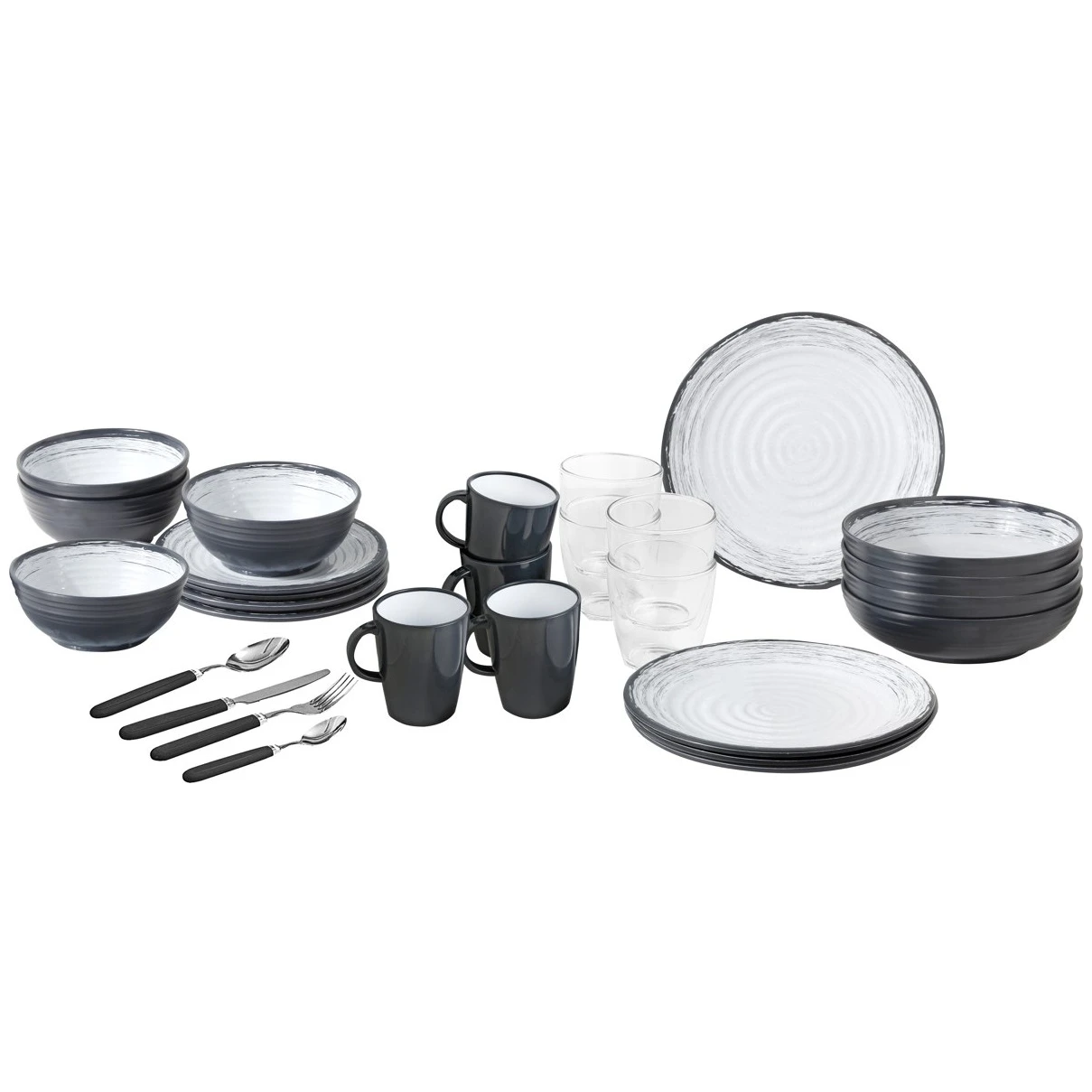 Le set comprend 4 grandes assiettes(Ø 26 cm), 4 assiettes creuses(Ø 21 cm), 4 petites assiettes(Ø 21 cm), 4 tasses (Ø 30 cl), 4 bols (Ø 15 cm), 4 verres (Ø 20 cl), des couverts (16 pièces) et une boîte de rangement. La vaisselle peut être lavée au lave-vaisselle.