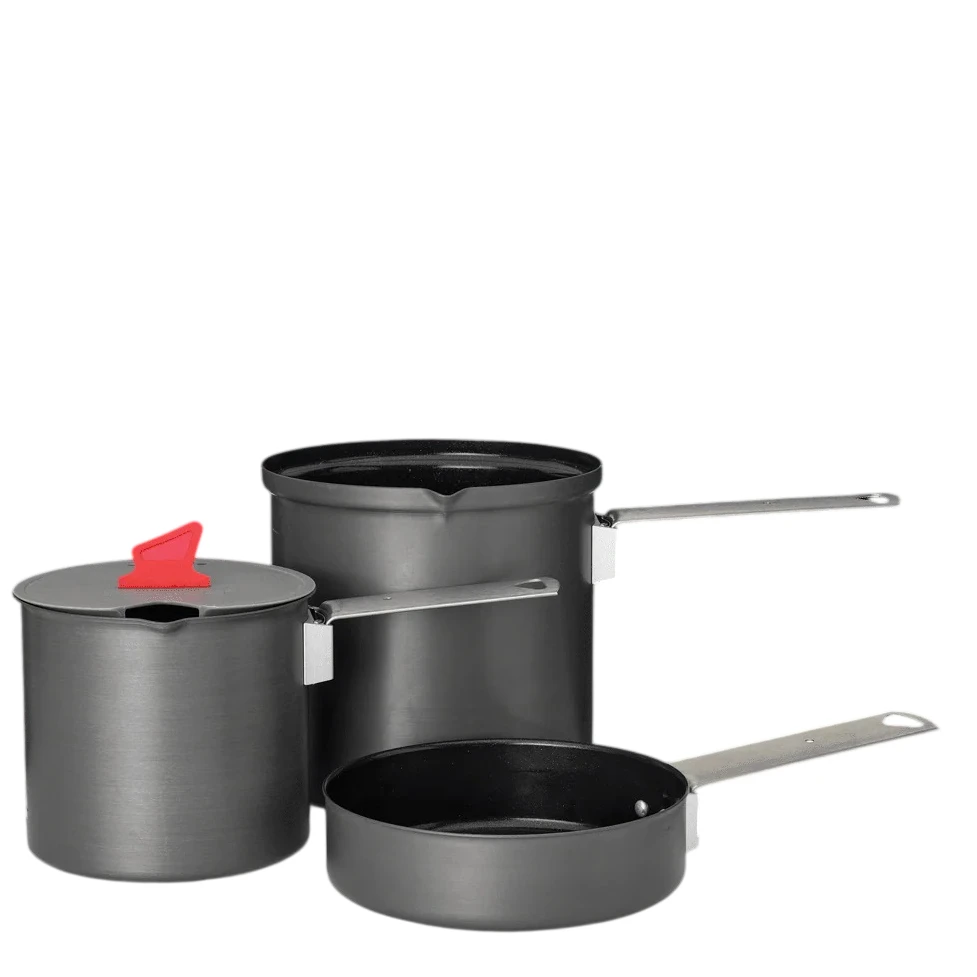 Primus Trek Pot est un ensemble de vaisselle compact pour cuisiner en extérieur et en camping. Deux casseroles, une poêle et trois poignées peuvent être emboîtées, ce qui permet d'économiser de l'espace pendant le transport.