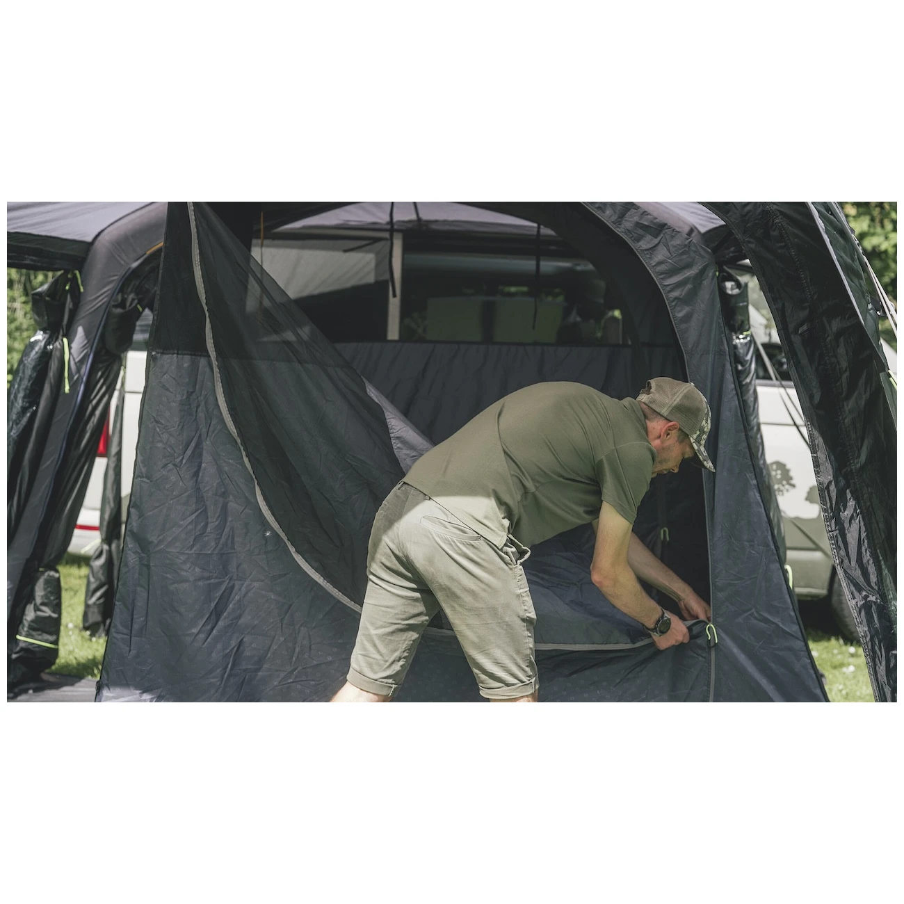 La grande entrée sans barrière avec moustiquaire mène à l'intérieur de la tente. Elle peut être entièrement repoussée sur le côté pour ne pas gêner, ou ouverte uniquement en haut pour une ventilation supplémentaire. Deux autres entrées latérales opposées permettent une ouverture complète de la tente. Les grandes fenêtres teintées offrent beaucoup de lumière, mais aussi une protection contre les UV et une grande intimité. Elles peuvent être fermées par des rideaux pour assombrir l'espace et mieux dormir.