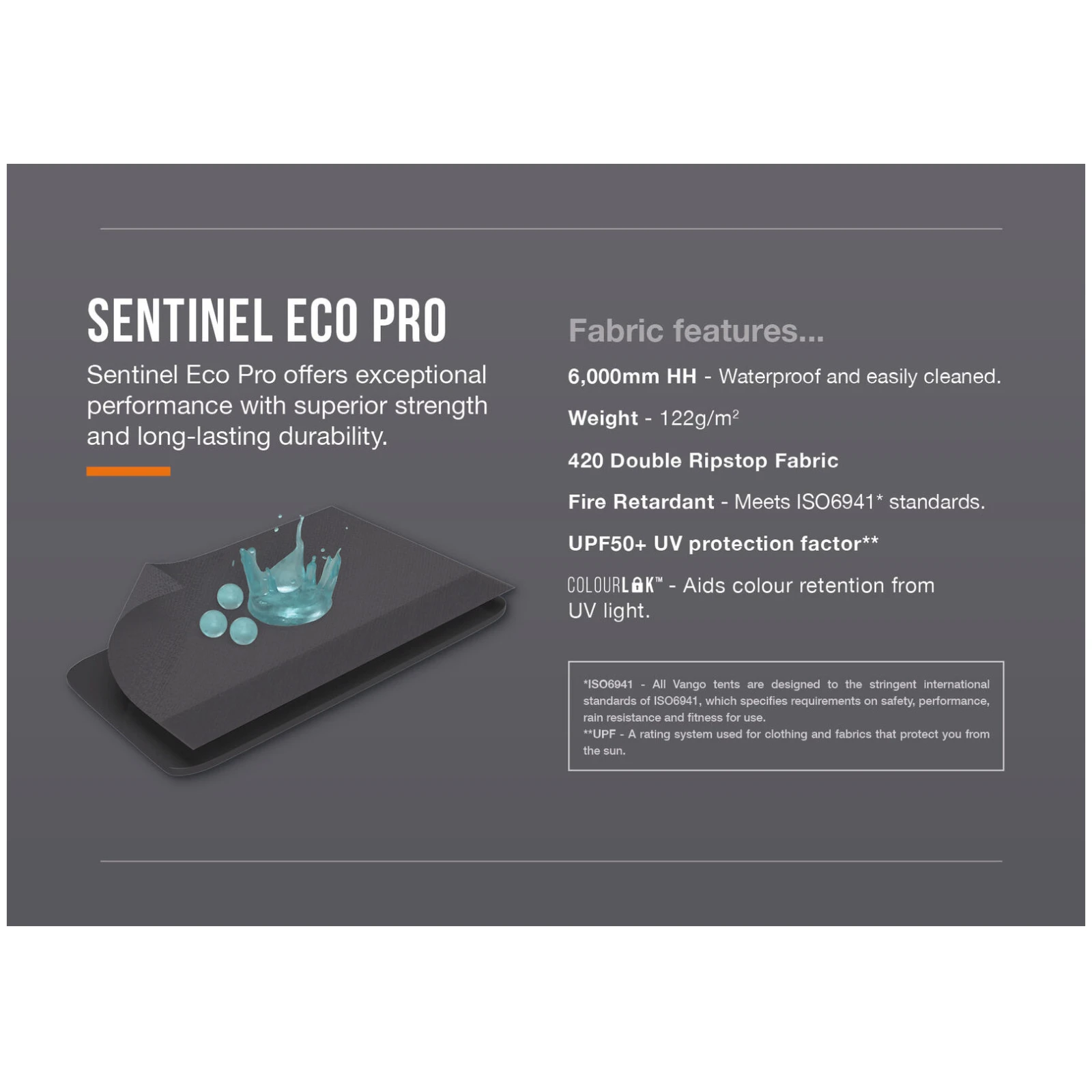 Partie supérieure de la tente double peau. Caractérisée par la colonne d'eau = capacité du matériau à résister à la pression de l'eau. Indiquée en millimètres.