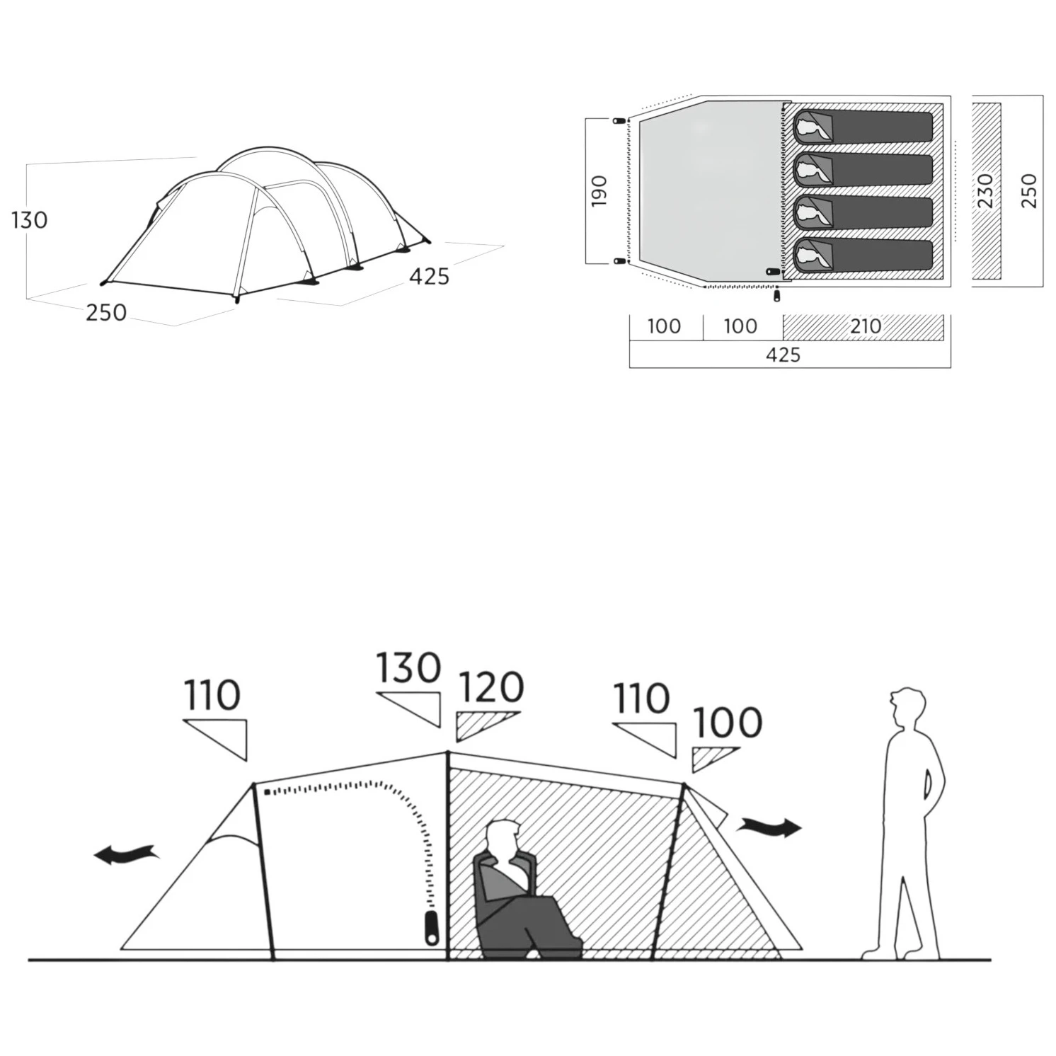 Valable pour la tente sans éléments supplémentaires (par ex. : piquets supplémentaires, housse, chambre à coucher, etc.)