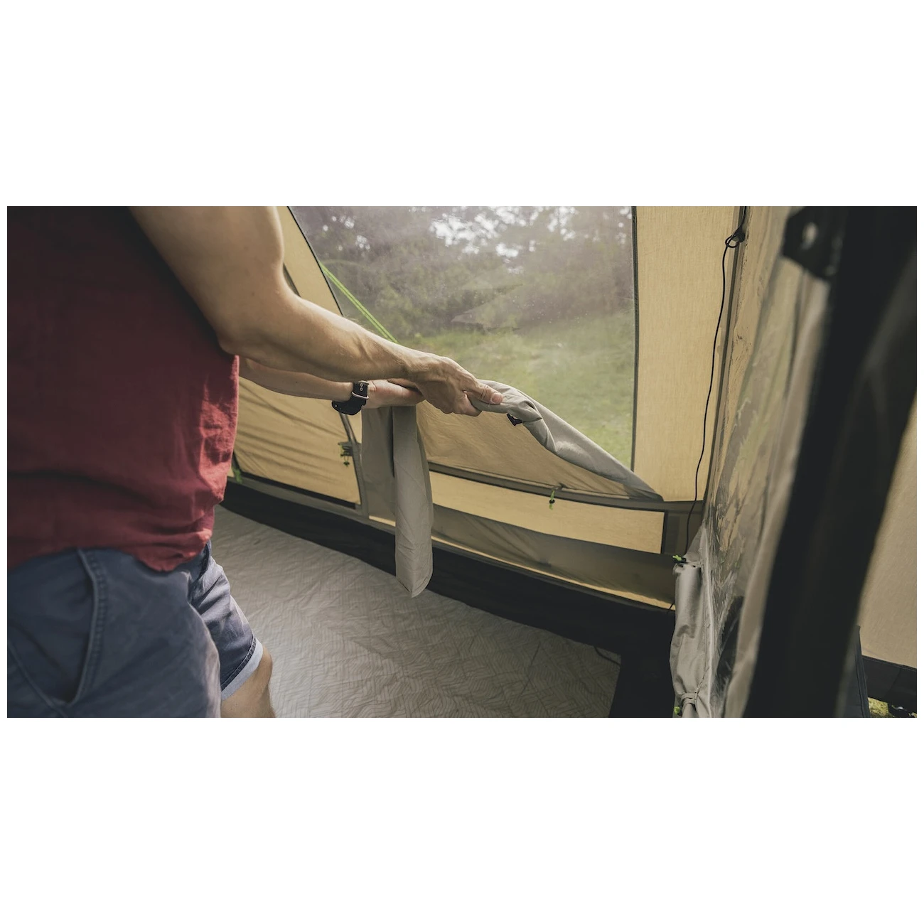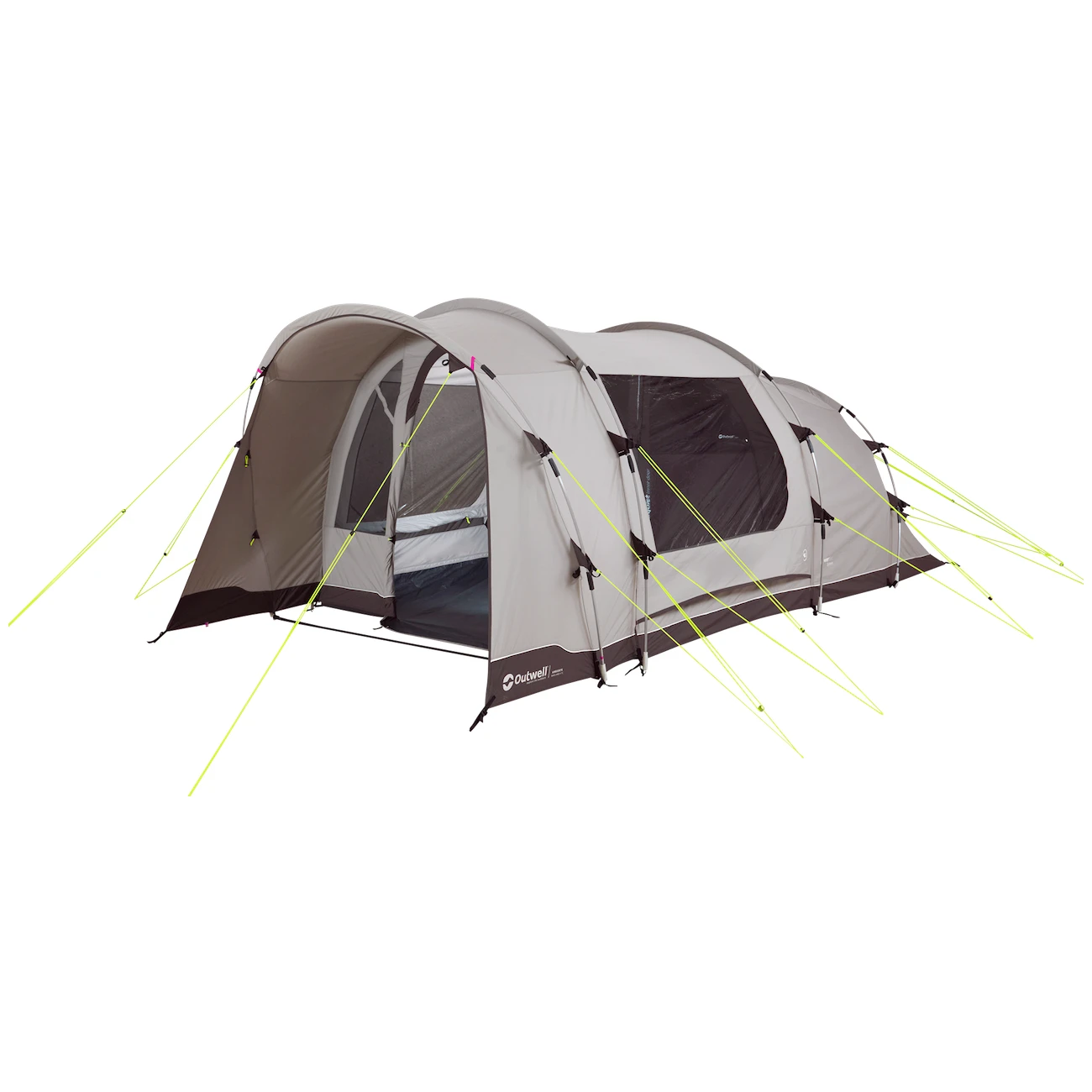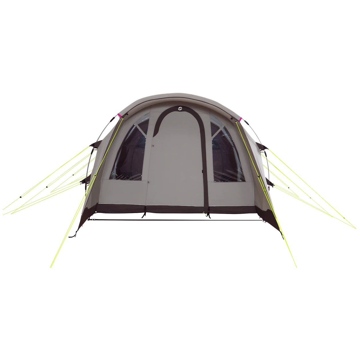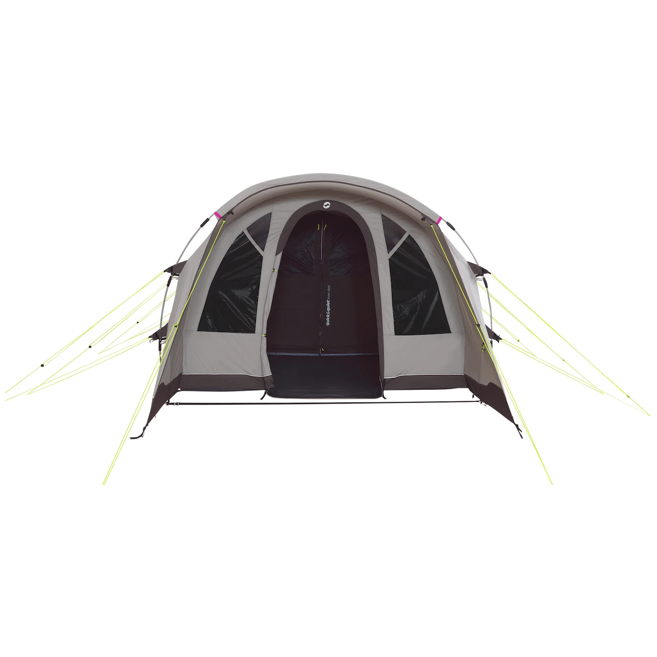 La tente est également dotée d'un système de ventilation sophistiqué. L'arrière de la tente est équipé d'un trou d'aération refermable avec une moustiquaire, qui permet à l'air de circuler dans la tente lorsque la porte ou les fenêtres sont ouvertes. Il comporte également des poches de rangement, des prises couvertes pour les rallonges électriques qui vous permettent de brancher une lampe ou de recharger votre téléphone portable. Vous apprécierez également le système Hooktrack, qui permet de fixer des objets légers, des câbles et des lampes sur des "rails" préparés à l'avance.