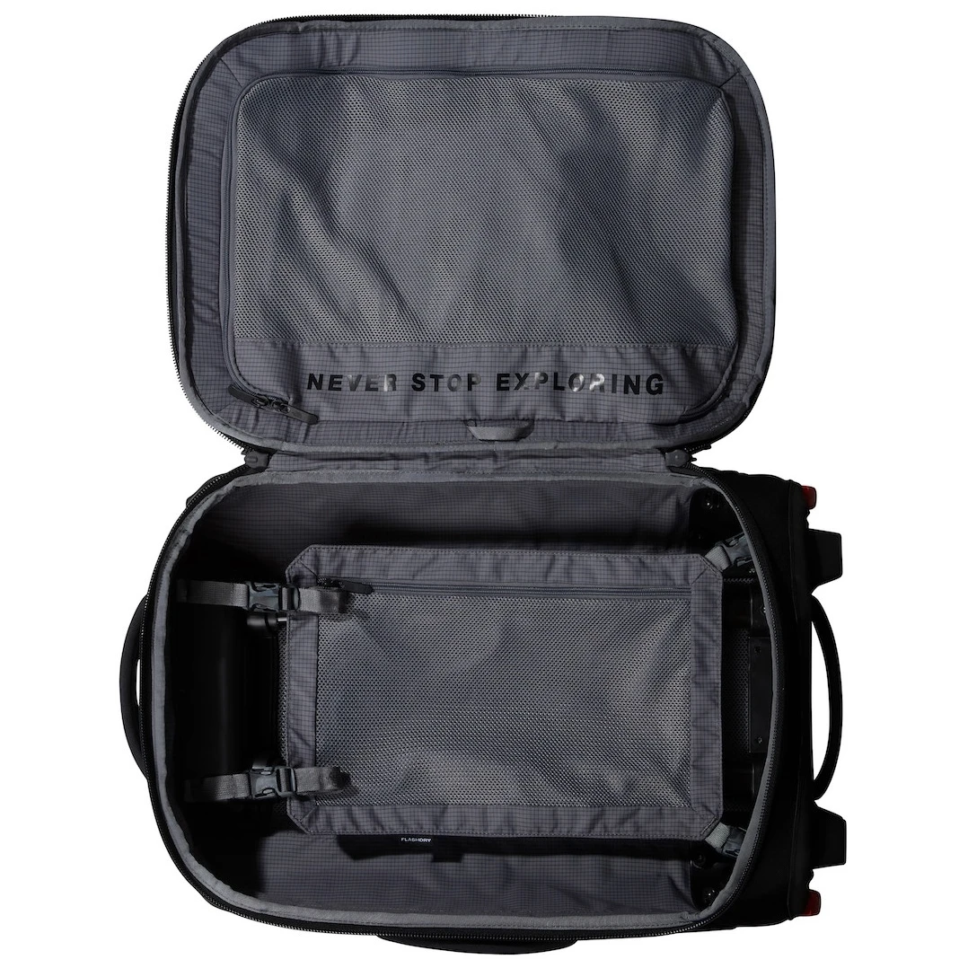La valise de voyage Base Camp Rolling Thunder 22 de The North Face combine une solidité sans compromis et une grande praticité. Elle est fabriquée en polyester recyclé avec un revêtement en PVC sans phtalates et est prête à affronter les conditions les plus difficiles et les voyages à travers le monde. Grâce à sa taille, vous pouvez l'emporter comme bagage cabine dans la plupart des compagnies aériennes.