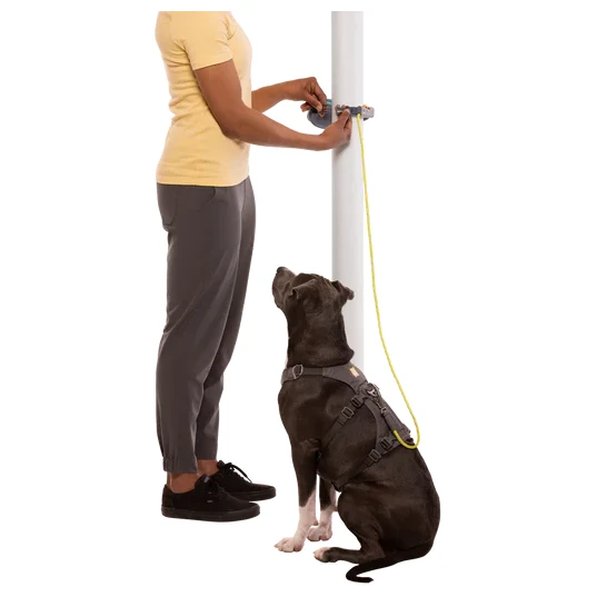 La base est le mécanisme ergonomique HitchLock™, qui vous permet de régler en douceur la longueur de la laisse souhaitée à l'aide d'un mousqueton. Du plus court jusqu'à 3,6 mètres de longueur. Le mousqueton fonctionne comme un système de freinage lorsque le câble est sous tension. Il est suivi d'un sac de rangement à l'intérieur duquel est enroulé le reste du câble que vous n'utilisez pas actuellement. Le sac de rangement sert également de harnais autour de la taille ou autour d'un poteau fixe.